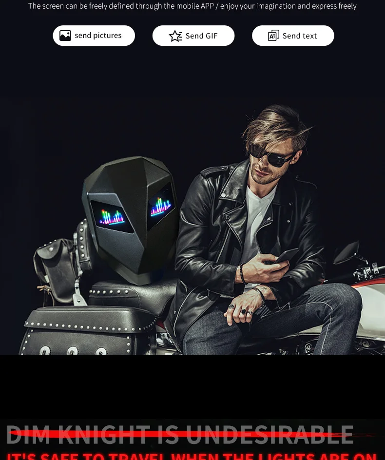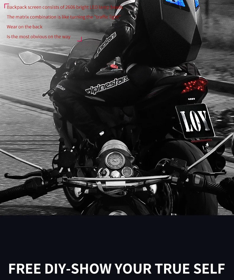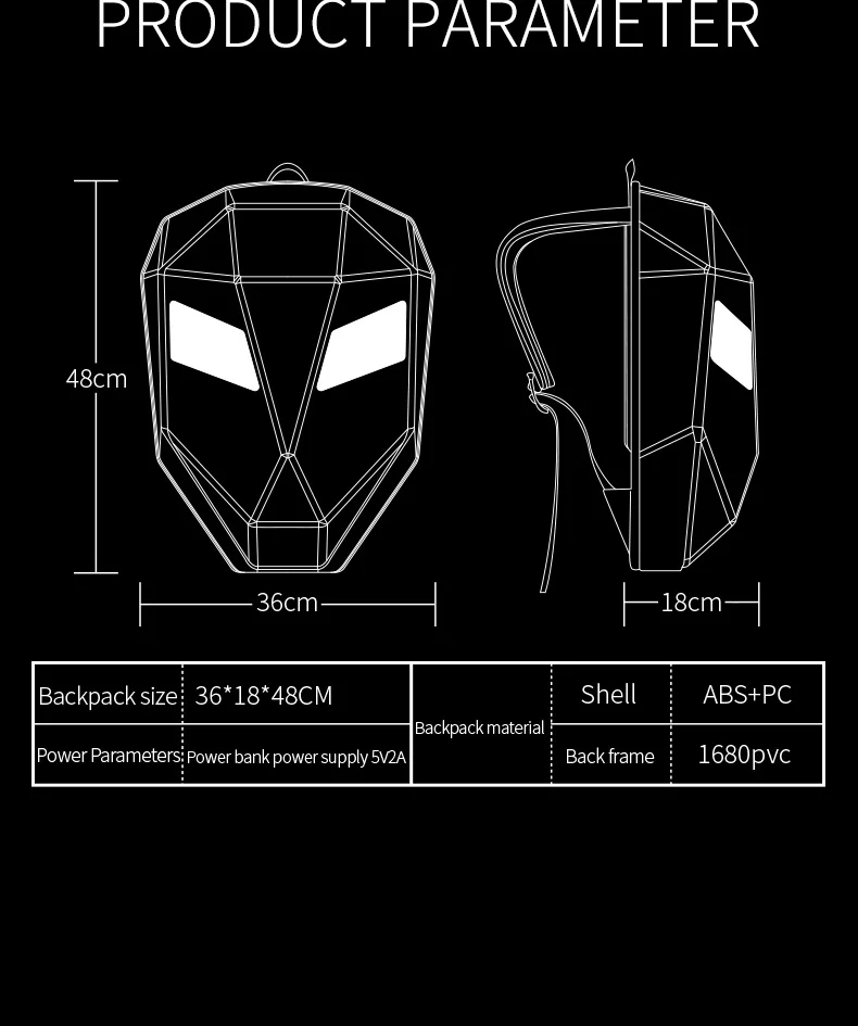 【Material】LED smart knight backpack appearance purchase 3D hardcore waterproof material;the back width using 1680pvc ,48*48 full-color dot matrix screen , support text , pictures , GIF , and other formats ;adjustable shoulder strap size; breathable material for the back